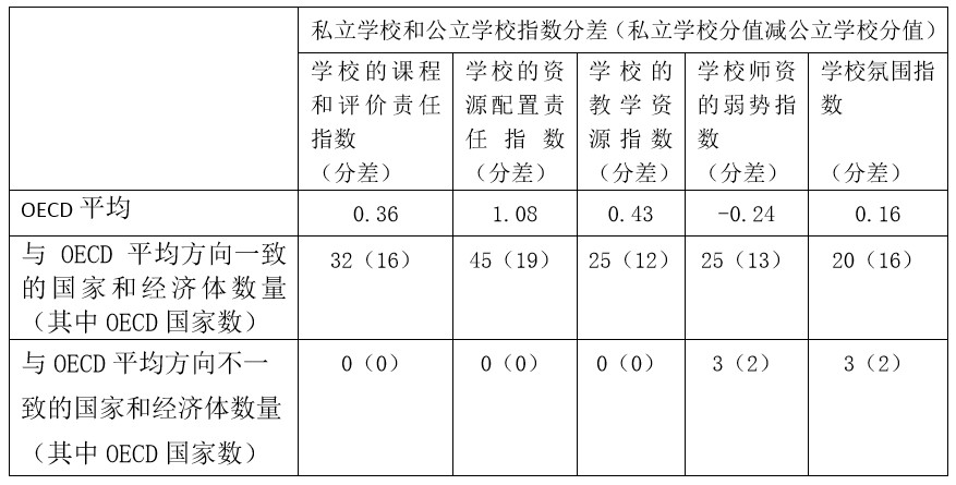 可见,在大多数 OECD 国家的学校系统中,私立学校比公立学校不仅具有更占优势的学生群体,还拥有更完善的物质资源、更好的师资以及更良好的学风。因而私立学校的整体表现在教育教学质量、学生个体背景以及学生群体构成等因素的共同作用下对公立学校形成较为明显的优势。