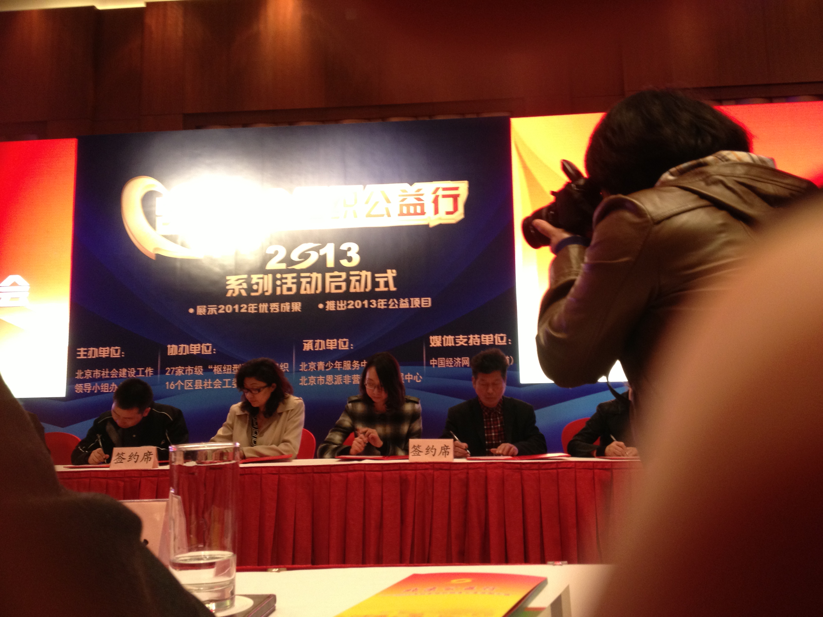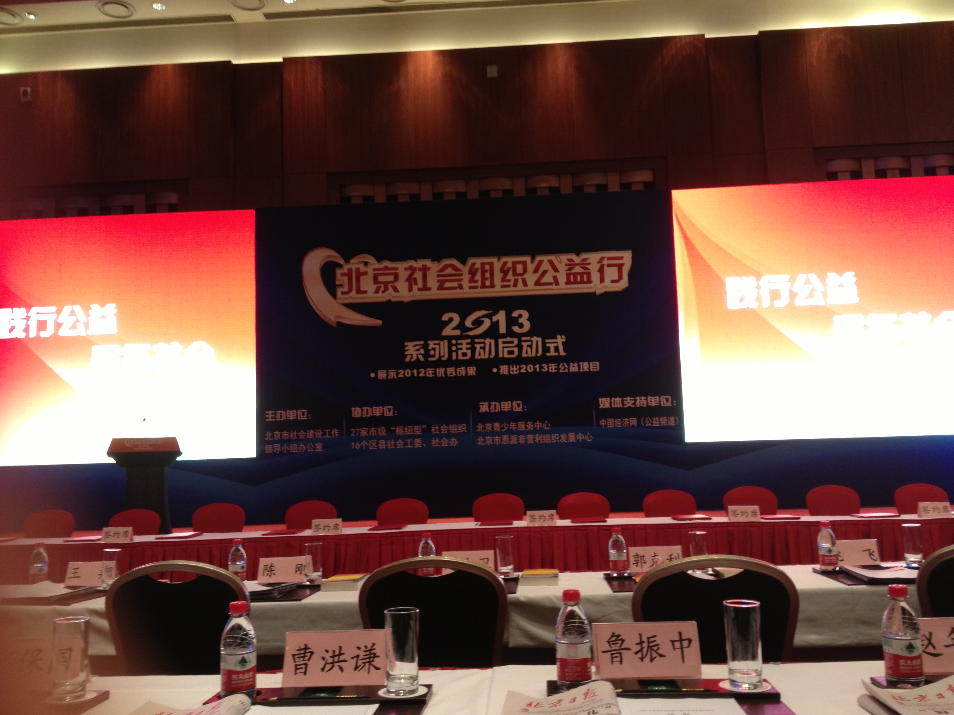 为促进广大社会组织参与社会公益事业并展示其良好风貌,大力践行“北京精神”、弘扬公益理念,2013年4月27日上午,由市委社会工委、市社会办主办,北京市27家市级“枢纽型”社会组织、16个区县社会工委、社会办协办,由北京市青少年服务中心、北京市恩派非营利组织发展中心承办的“2013年北京公益行启动仪式暨优秀公益项目交流会”在北京国家会议中心C区A厅举行。