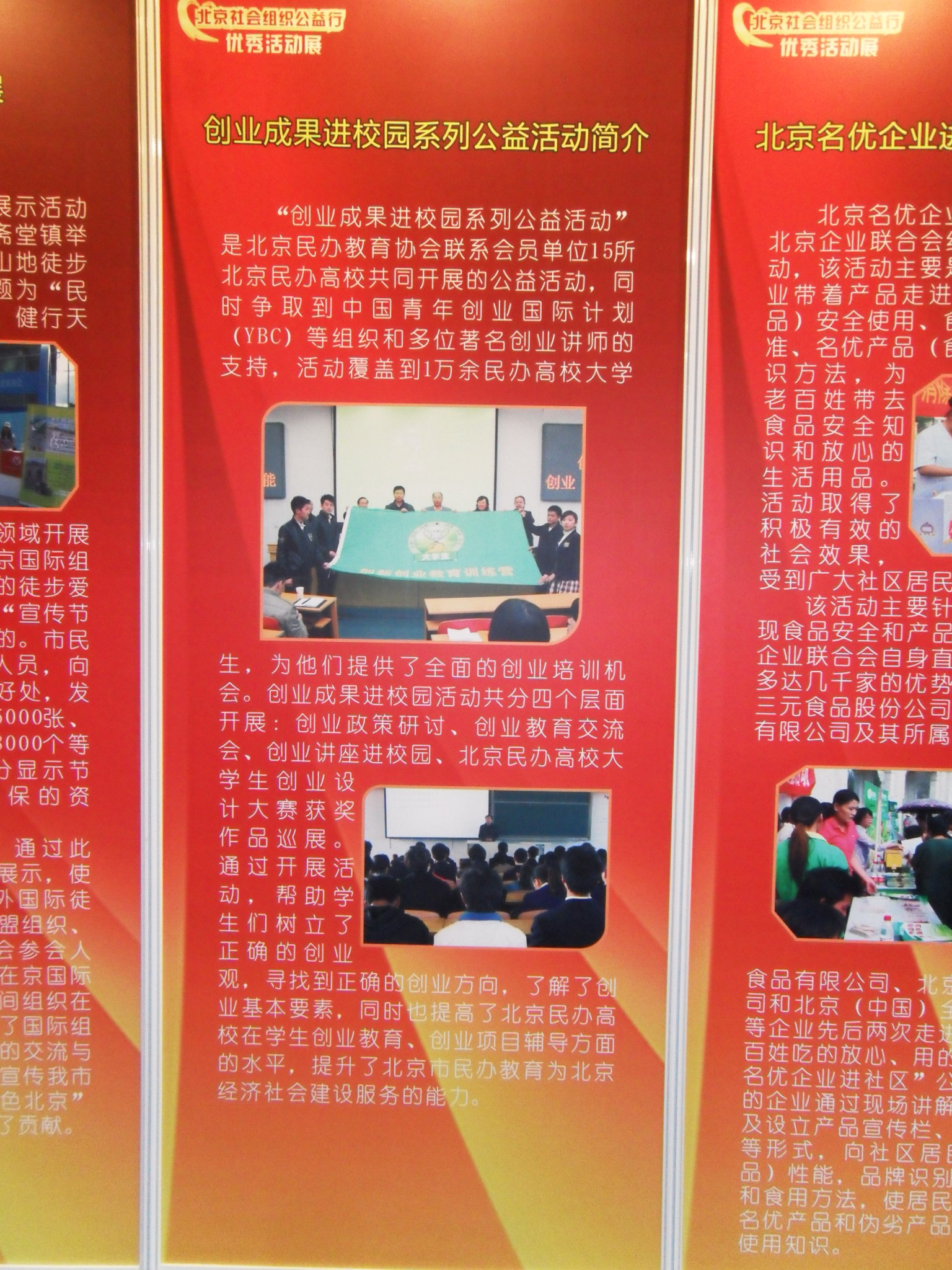 协会领导高度重视2012年“北京公益行”活动,及时召开工作会议,传达“北京公益行”工作精神,认真策划,精心统筹,广泛组织全市民办教育领域的社会组织参与到该项活动中,并将此活动贯穿全年。协会的工作得到市委社会工委、市社会办的充分肯定,在“2013年北京公益行启动仪式暨优秀公益项目交流会”上授予协会“2012年‘北京社会组织’系列活动组织奖”,并表彰协会“创业成果进校园系列公益活动”和“首都大学生人文综合素养提升计划”两项活动为优秀公益活动。