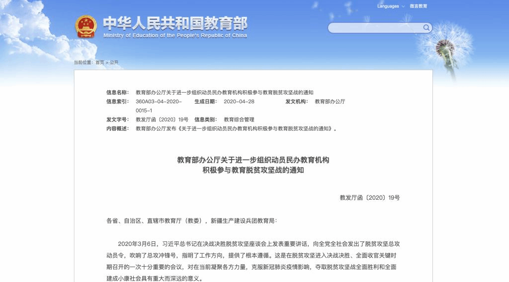 脱贫攻坚,功在当代、利在千秋。教育脱贫攻坚战已进入全面总攻阶段,时不我待,各民办教育机构要迅速行动,主动作为,为打赢脱贫攻坚战、全面建成小康社会作出新的更大贡献。各地教育行政部门、各民办教育协会要加强组织引导,做好政策宣讲,及时总结推广民办教育机构在教育脱贫攻坚工作中的新举措、好做法,广泛宣传报道先进典型的优秀事迹和感人故事,强化正面引领,营造助推脱贫攻坚的良好氛围。请各省、自治区、直辖市教育厅(教委),新疆生产建设兵团教育局,中国民办教育协会将相关落实情况于2020年5月底前报教育部发展规划司。