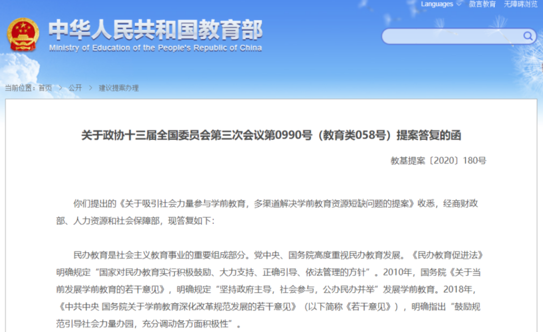 近日,教育部官网发布《关于政协十三届全国委员会第三次会议第0990号(教育类058号)提案答复的函》,对全国政协委员提出的建议“吸引社会力量参与学前教育,多渠道解决学前教育资源短缺问题”予以答复。