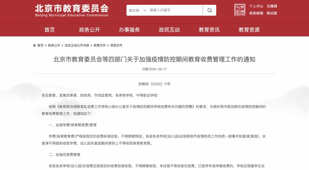 北京市教育委员会等四部门关于加强疫情防控期间教育收费管理工作的通知