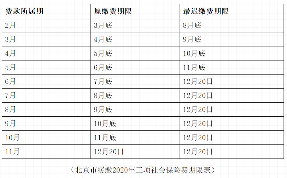 首次受理缓缴申请安排在 2020年3月9日至14日;4月至11月期间每月1日至5日安排受理缓缴申请。审核结果于当月受理期结束后5日内以短信形式告知。审核通过的参保单位,当月生效,且只需申请一次,无须每月申请,原缴费期限在申请当月及以后的每月应缴费款,均可在《北京市缓缴2020年三项社会保险费期限表》相应月份“最迟缴纳时间”前缴纳。