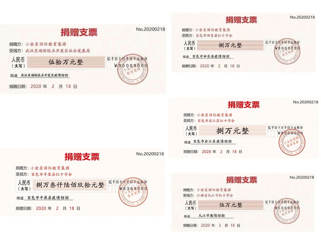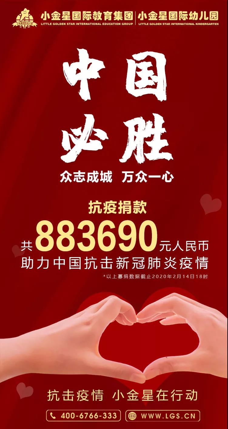 在此次疫情间,“小金星”秉承着“爱心教育、服务社会”的办学宗旨,发扬大爱精神,发起防疫新冠病毒捐款活动倡议,谢燕川董事长身体力行,带领全体小金星教职工积极参与到自行捐款活动中来,截止2月14日合计捐款88.3690万元人民币。目前,该款项分别捐往福建省政协提供的湖北抗疫医护人员抗疫专户、广西省百色地区、江西省九江统战部提供的捐款专户,助力各地抗击新型冠状病毒肺炎疫情。