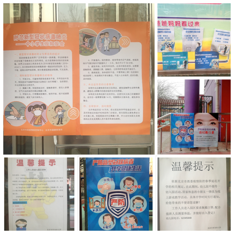 利用橱窗、健康园地开展不同形式的防控新型冠状病毒肺炎宣传教育。孩子们的健康是老师们最为关切的。老师们每天都会与家长沟通孩子们健康情况、返京情况,园长更是一遍又一遍的将班级数据核实上传。教职工每天的健康日报会通过钉钉办公软件进行填报,园长将数据及时导出上传。每天园所值班的领导将所有幼儿、教师的健康、返京信息进行台账的登记。