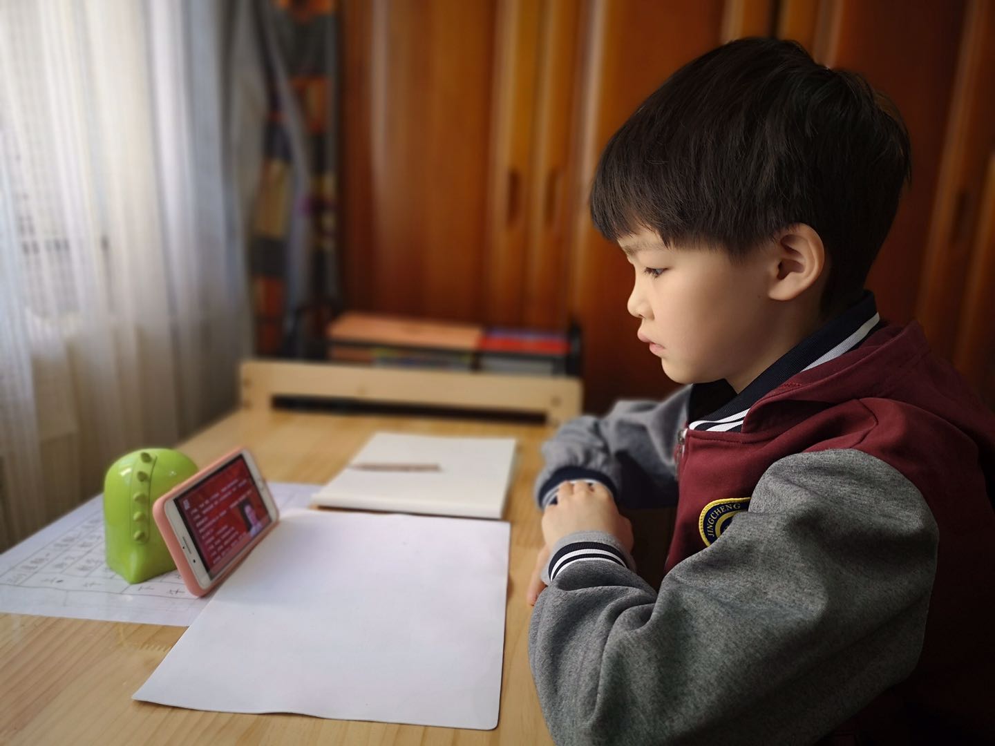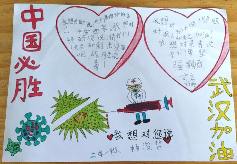 抗击疫情活动中,众多医护工作者冲锋在前。三年级1班的蒋世轩对所有的医护人员说:“你们为了中国这个大家,舍弃自己的小家,你们的付出让我感动,谢谢你们在国家危难时刻挺身而出!”