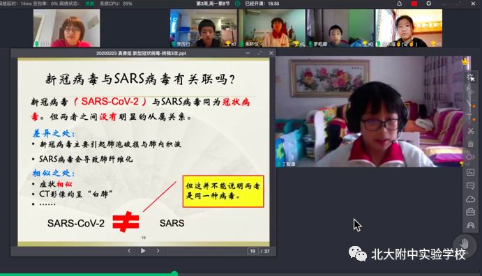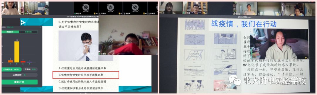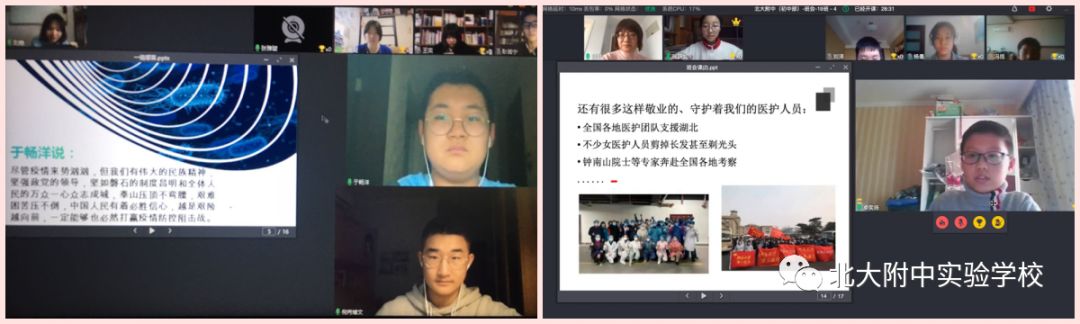面对肆虐的疫情,中华民族显示出空前的团结和无畏的勇气。每一个中国人都用自己的方式为这场战“疫”做出了贡献,北大附中实验学校的学生也不例外。师生利用云课堂的形式坚持学习,并在云班会课上直击一线,关注疫情。非常时期,师生们都深知,战“疫”是大家的必修课,这堂课不容缺席,我们必定通过!