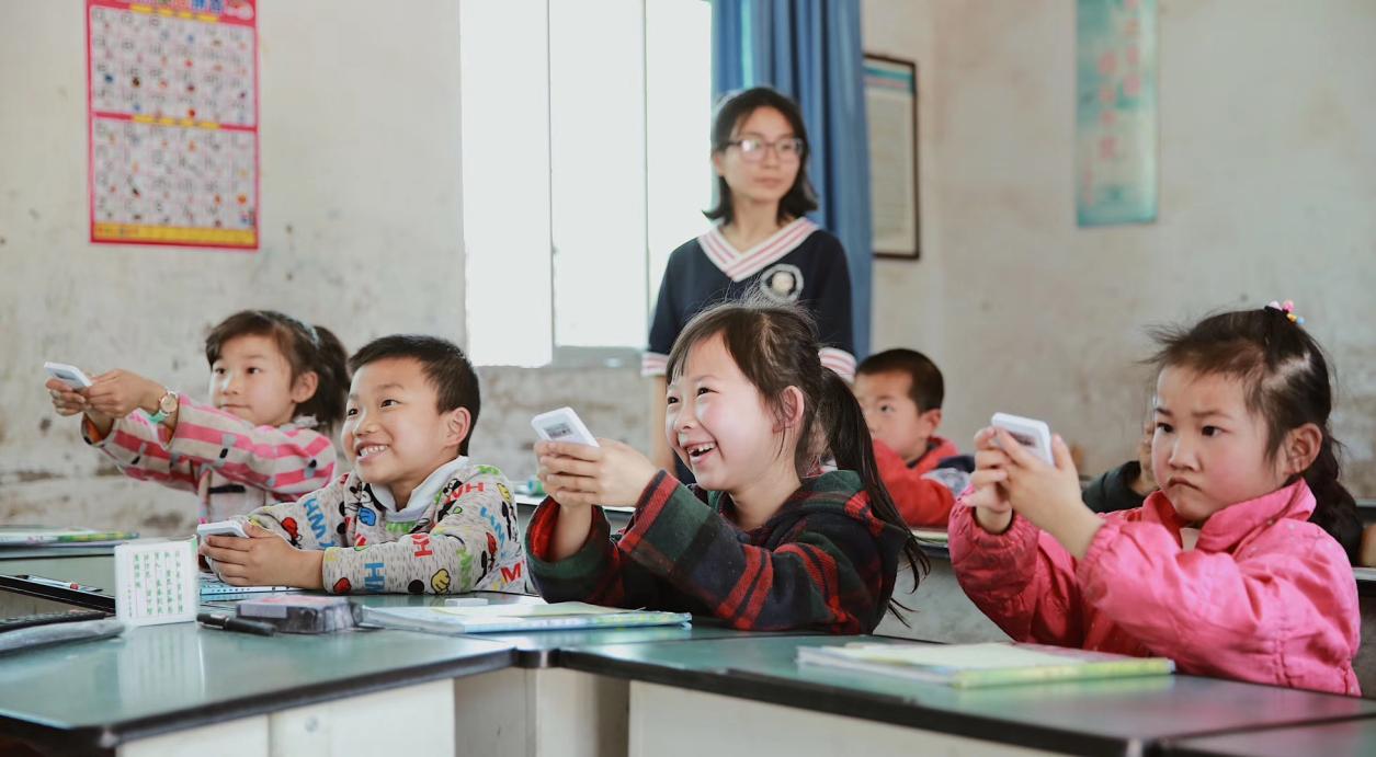 肩膀计划的双师课堂上,孩子们使用答题器回答问题