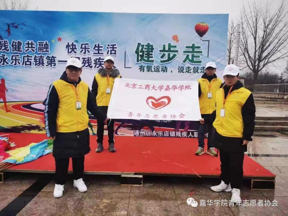 2019年11月,北京工商大学嘉华学院青年志愿者协会联合温馨家园职康站开展了第一届残疾人健步走志愿活动,此次志愿活动的目的是为进一步鼓励残疾人积极运动,融入社会,积极参与社会活动。满足残疾人的健身需求,提升残疾人的身体素质,既能使他们达到锻炼的目的,也能提升他们的生活质量,使他们的日常生活充满阳光、充满关爱、更加充实,也更加幸福。