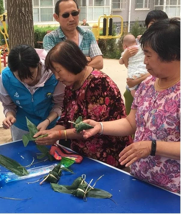 夕阳再晨团队的志愿者们与老人们一起包粽子