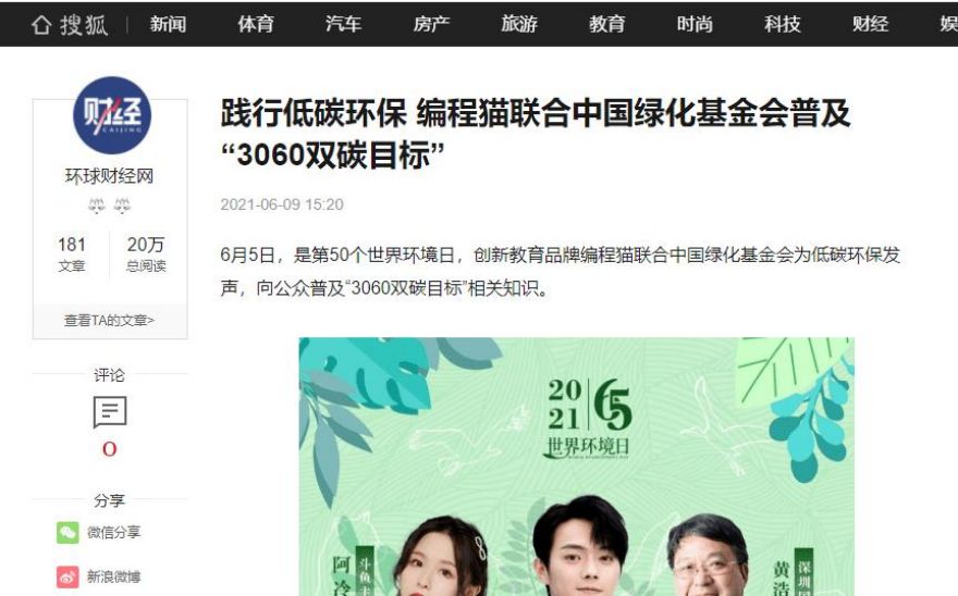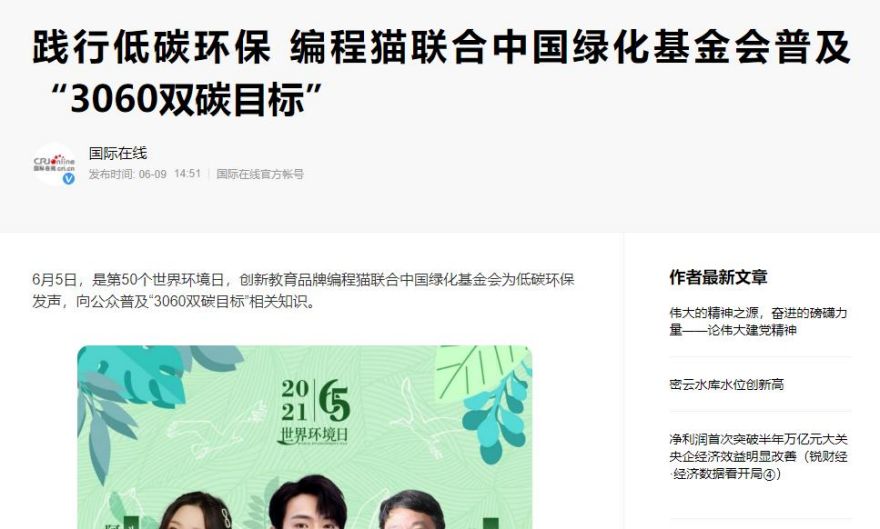 践行低碳环保 编程猫联合中国绿化基金会普及“3060双碳目标”(国际在线、环球财经)