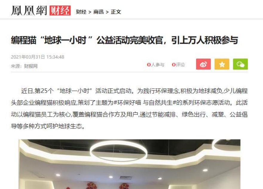 编程猫“地球一小时 ”公益活动完美收官,引上万人积极参与(凤凰网)