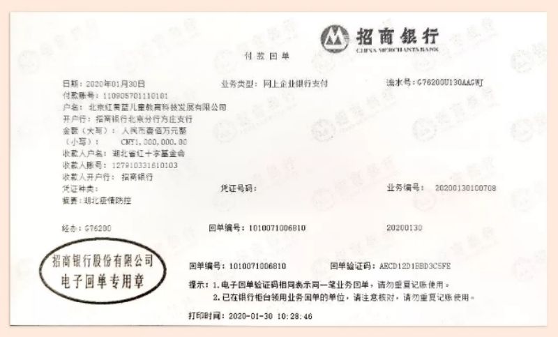红黄蓝教育机构通过湖北省红十字基金会捐赠100万现金,援驰湖北。