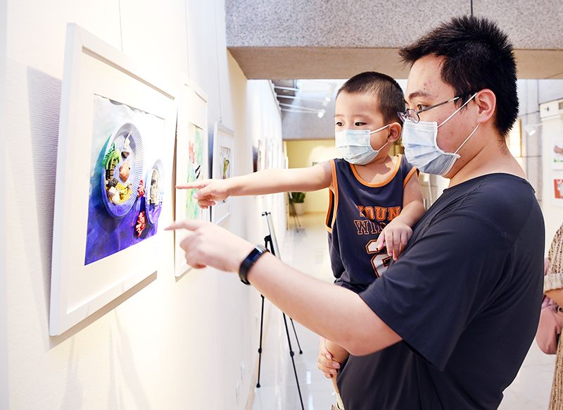家长和孩子一起参观画展