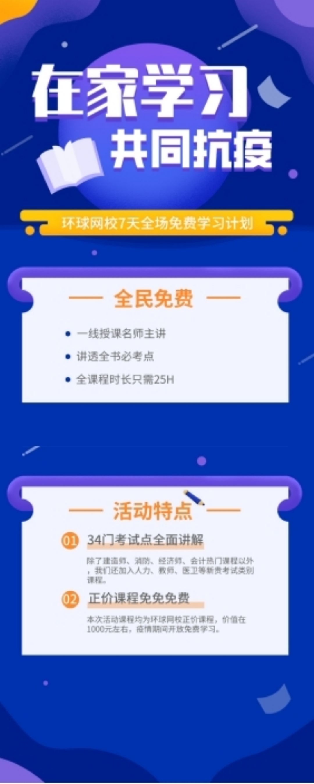 疫情突发后,为积极响应国家“停课不停学”号召,环球网校迅速联合新浪教育公益课程平台,在“抗击新型肺炎 教育系统在行动”专题中,免费开放了45门优质资源课程。这些课程包括:消防工程师考试1V1精讲,一级建造师考点精讲班公共课,二级建造师直播精讲班公共课,一级造价工程师直播精讲班全科,二级造价考点精讲班全科,中级经济师-经济基础,高级经济师-搞定国民经济学等。