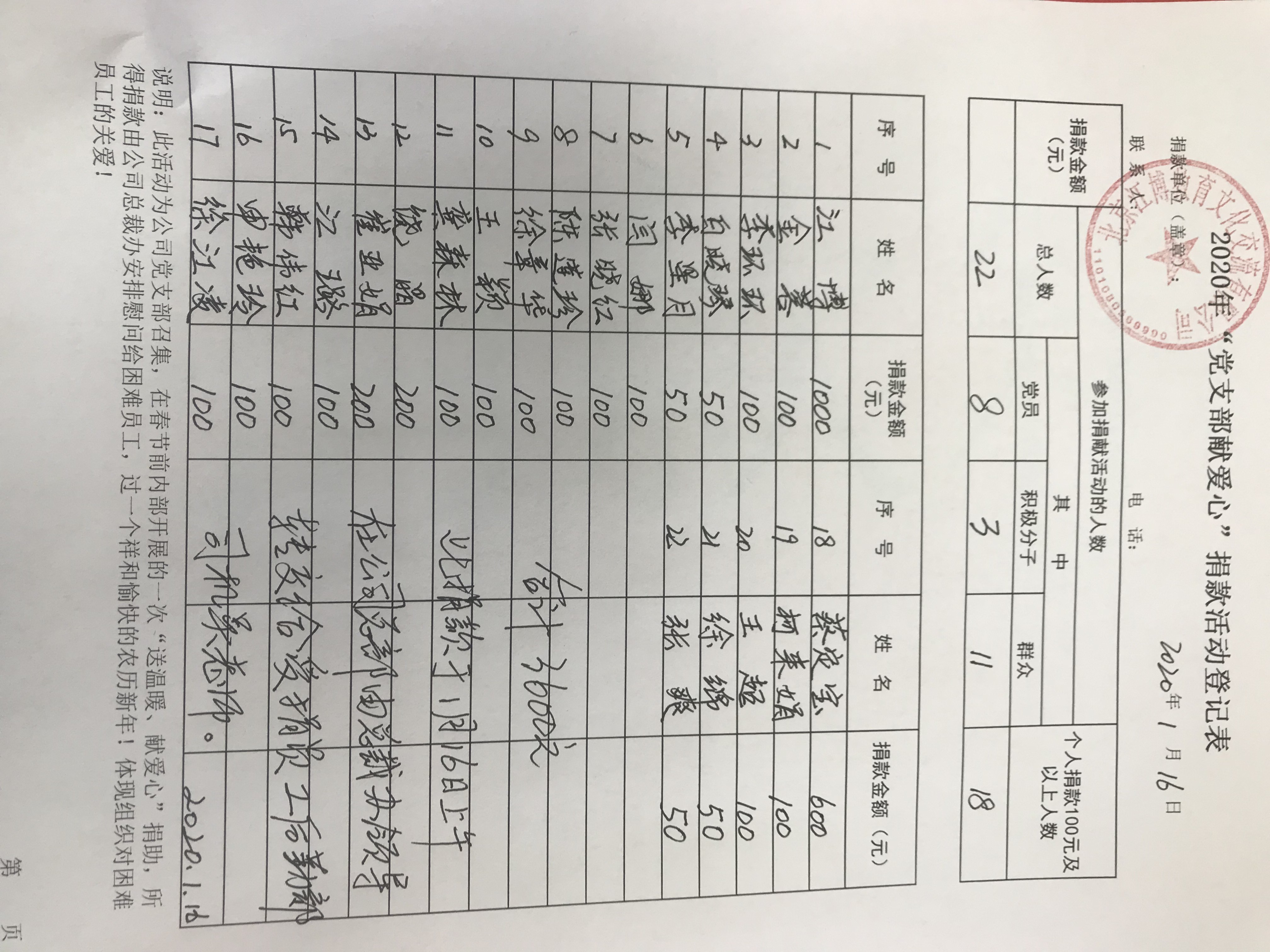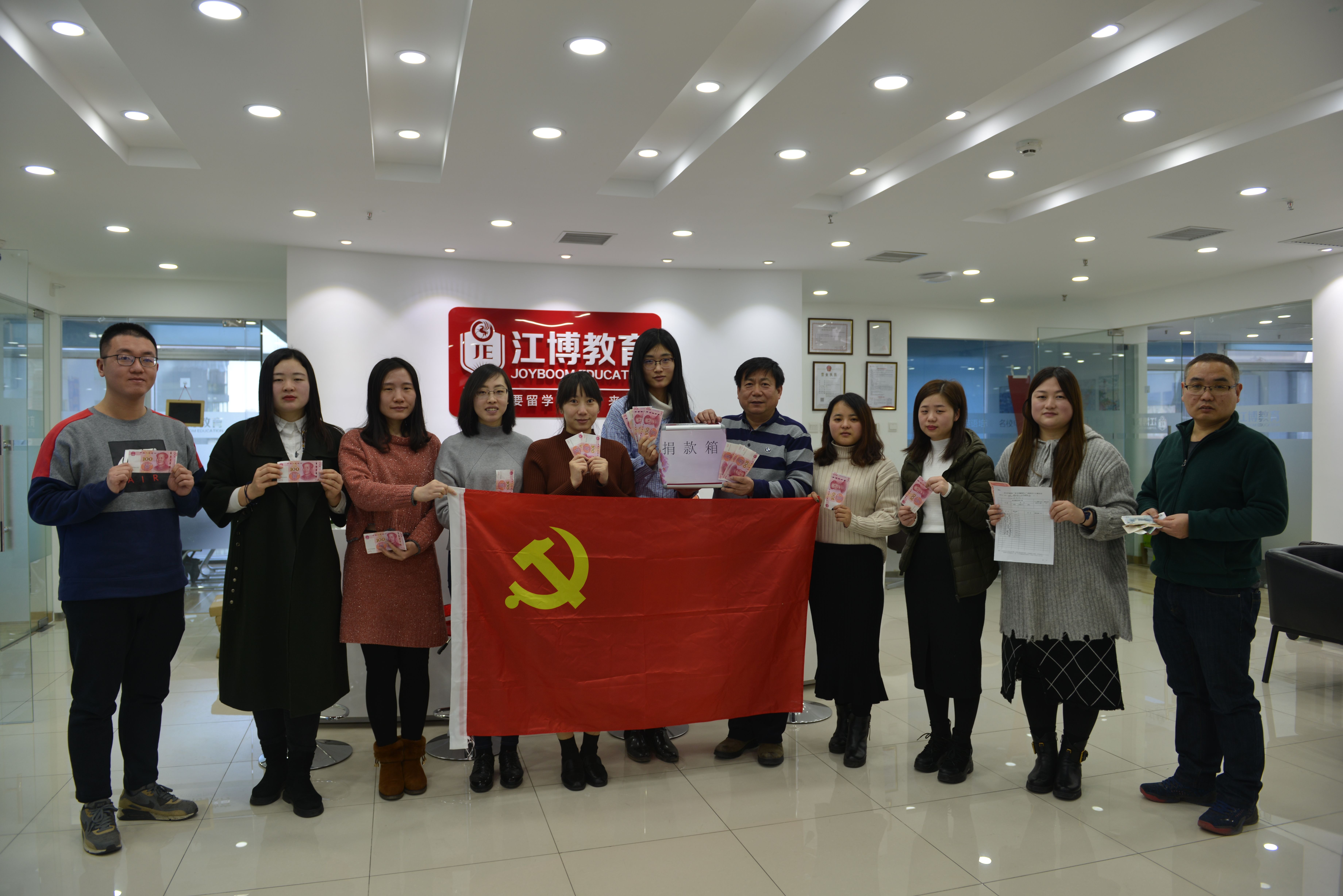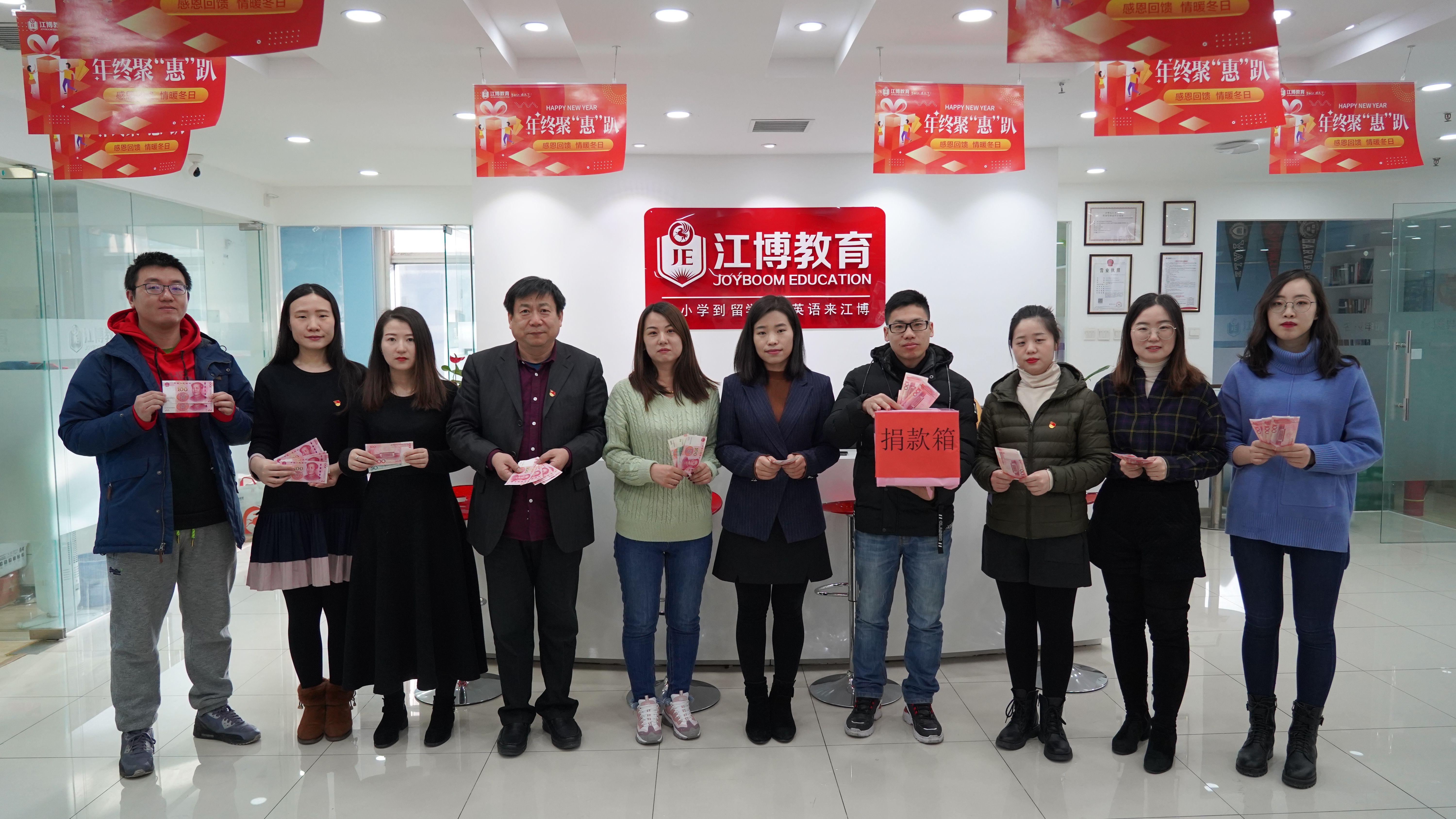 2020年1月,江博教育党支部组织春节献爱心捐款活动,组织党员和员工对困难员工“奉献一片爱心,送上一份温暖”,共收到捐款3600元,由总裁办领导转交给困难员工。