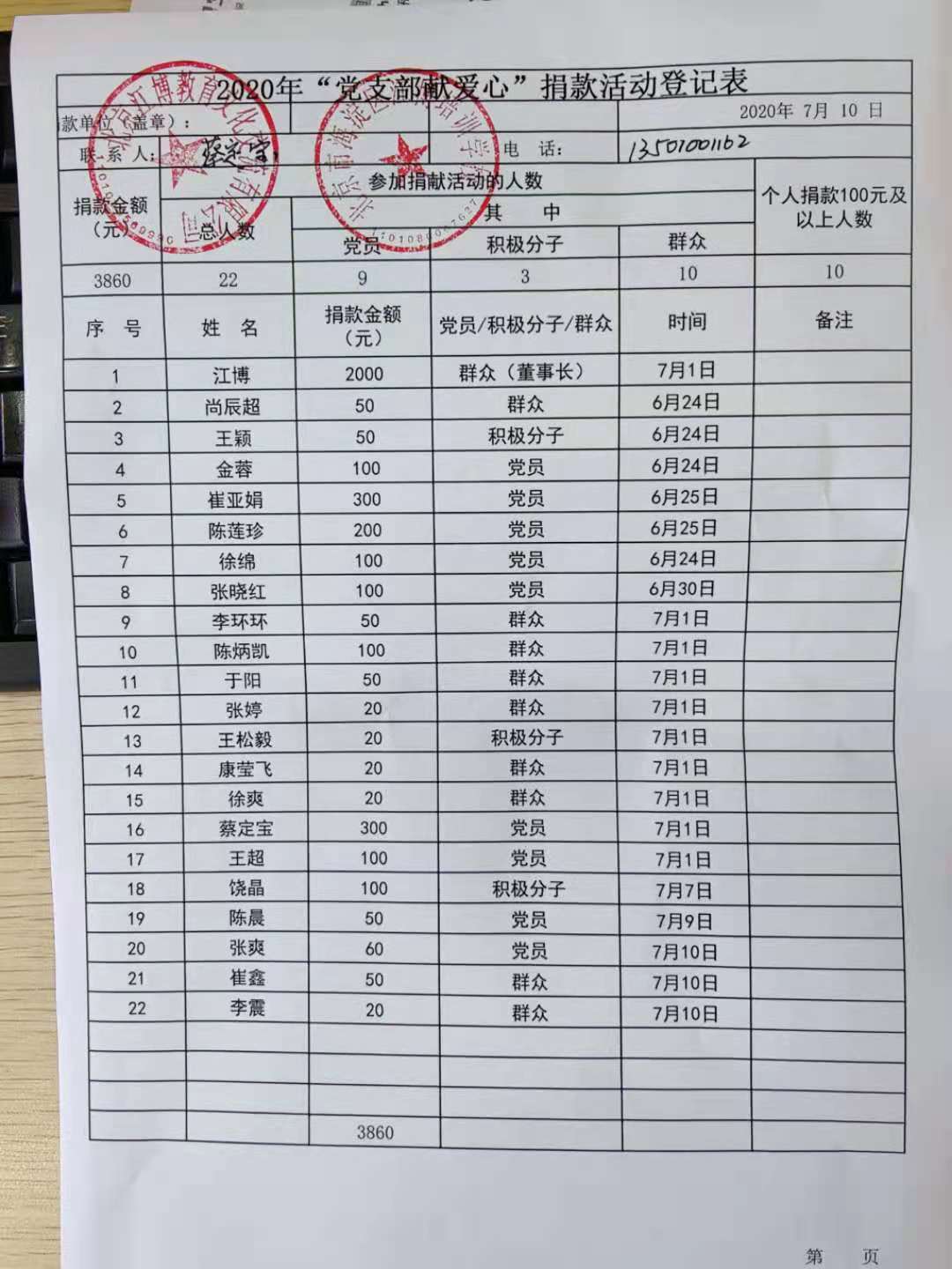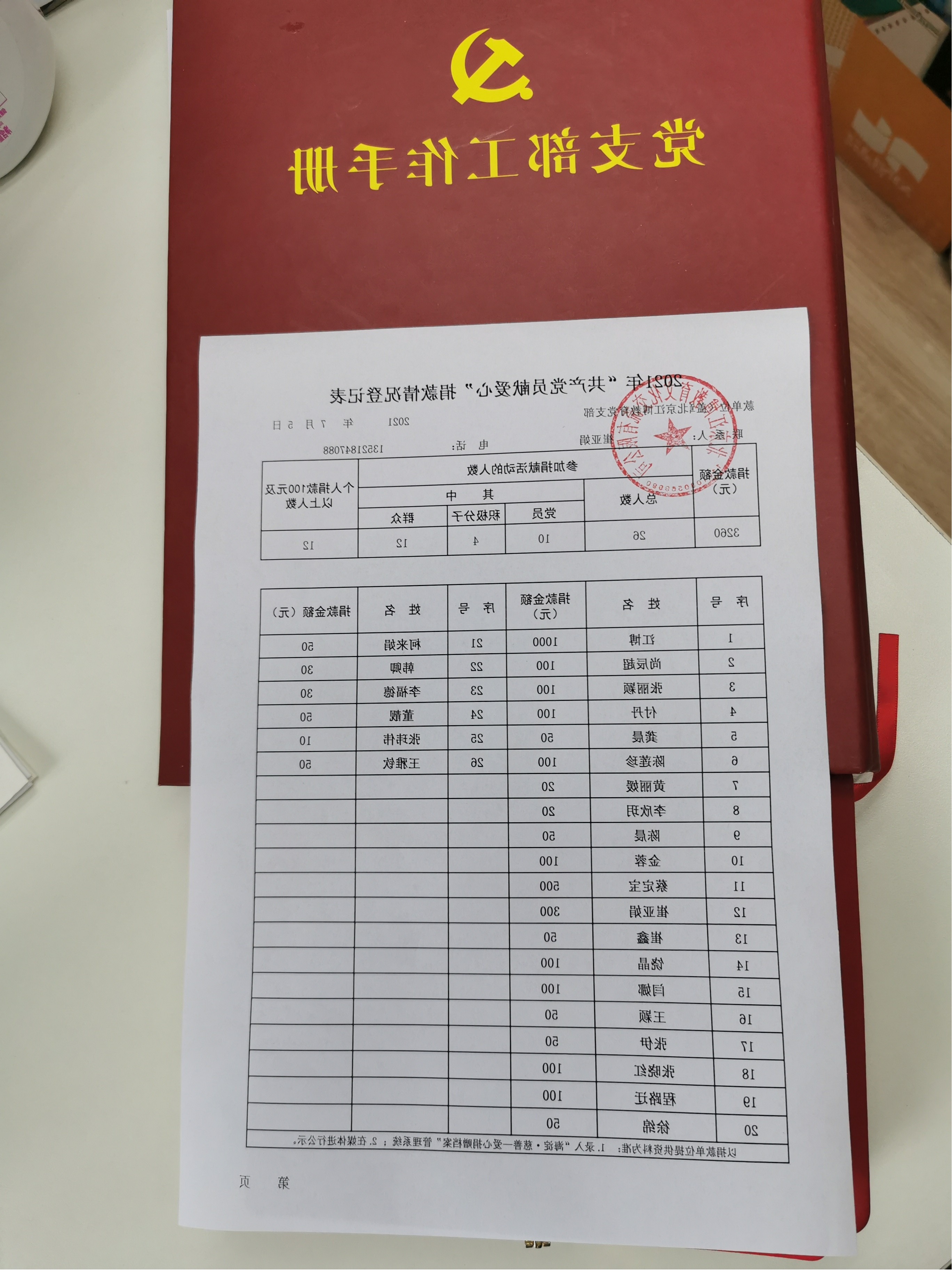 2021年7月为庆祝中国共产党成立100周年,江博教育党支部发起了共产党员献爱心活动,组织号召党员,积极分子参与,共收到捐款3260元。