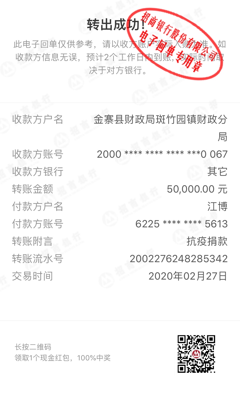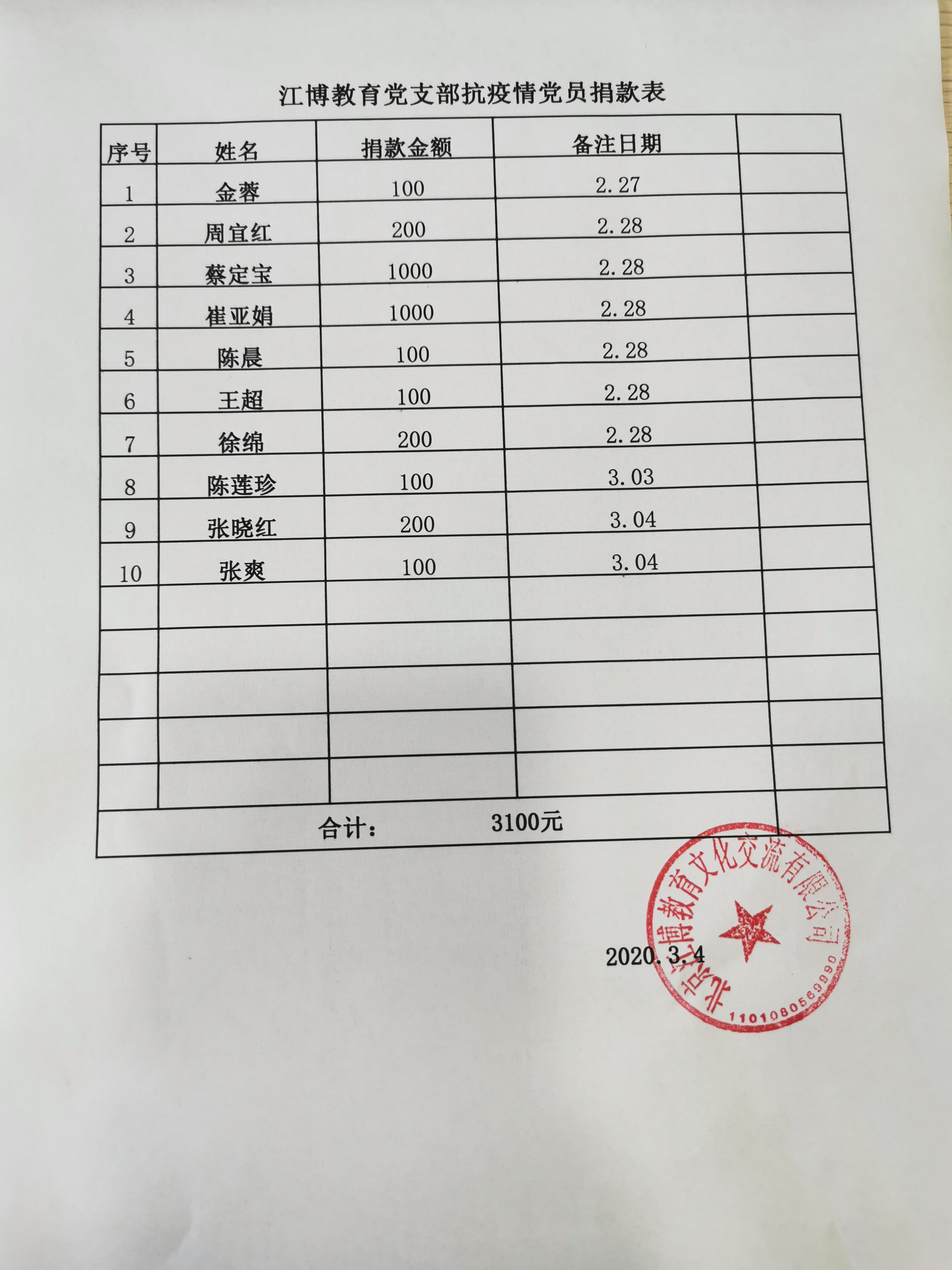 为响应中组部号召,抗击疫情党员带头,2020年江博教育党支部号召支部全体党员为抗击疫情捐款,江博教育党支部党员共计捐款3100元;江博教育总裁江博以个人名义给家乡政府捐款5万元人民币,以实际行动为家乡抗击疫情做出贡献。