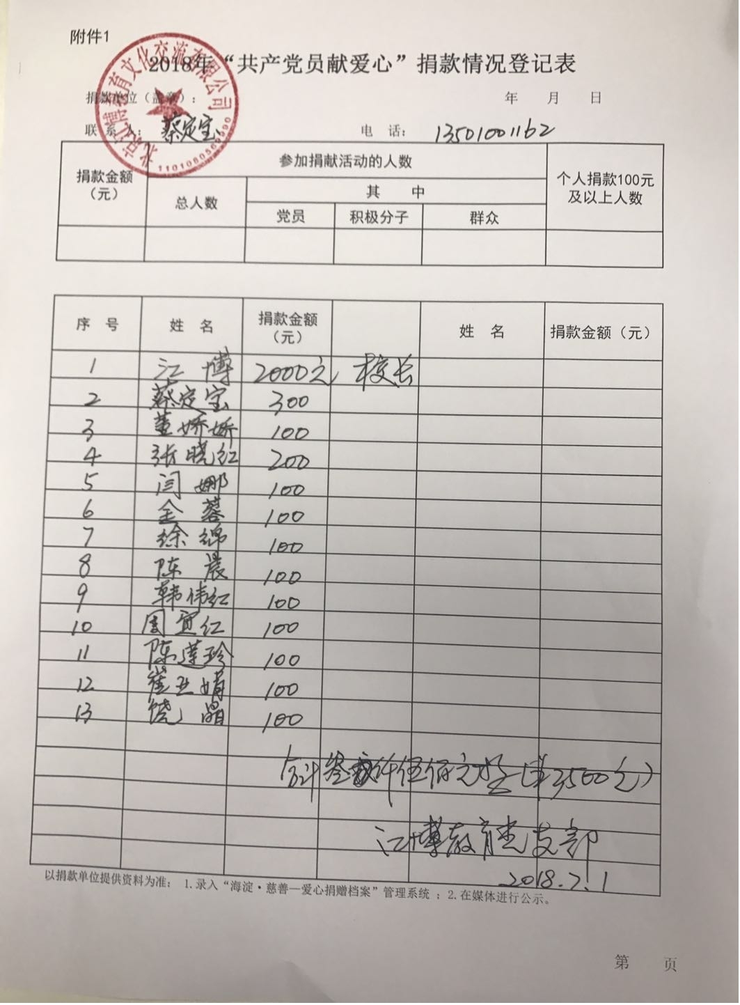 2018年7月,为迎接中国共产党建党97周年,江博教育党支部积极响应上级党组织号召,动员支部党员、入党积极分子“不忘初心,奉献爱心”进行捐款。此次捐款活动共有13人参与,其中党员同志8位,积极分子4位,公司总裁江博捐出2000元,整个活动收到捐款3500元。