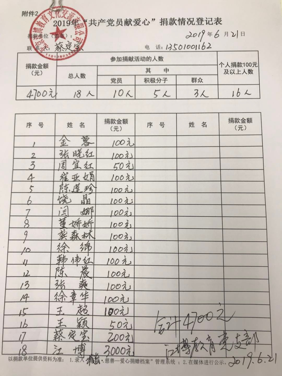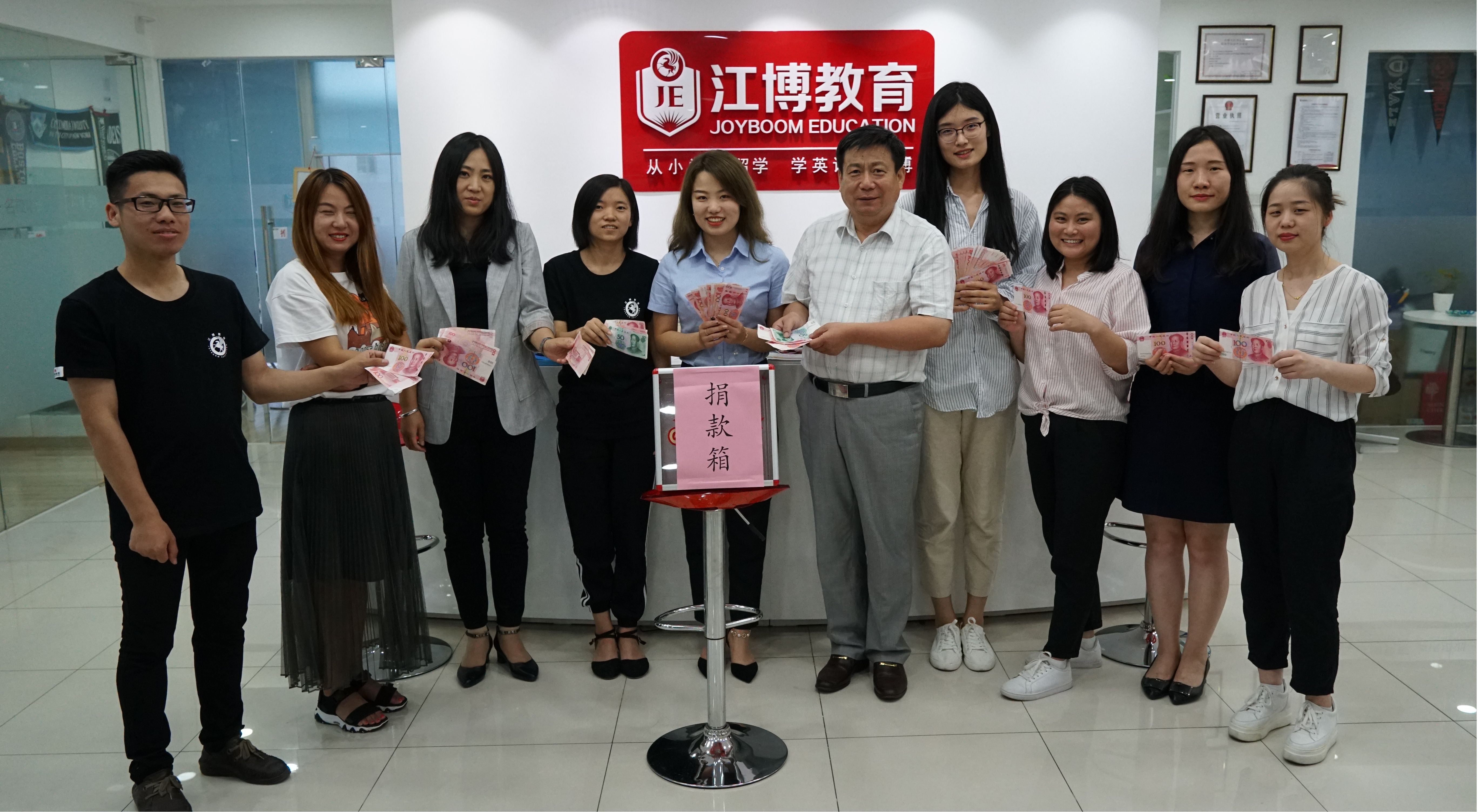 2019年7月,江博教育党支部迎接“建党98周年”献爱心活动,党员和积极分子积极参与,总共捐款4700元人民币。