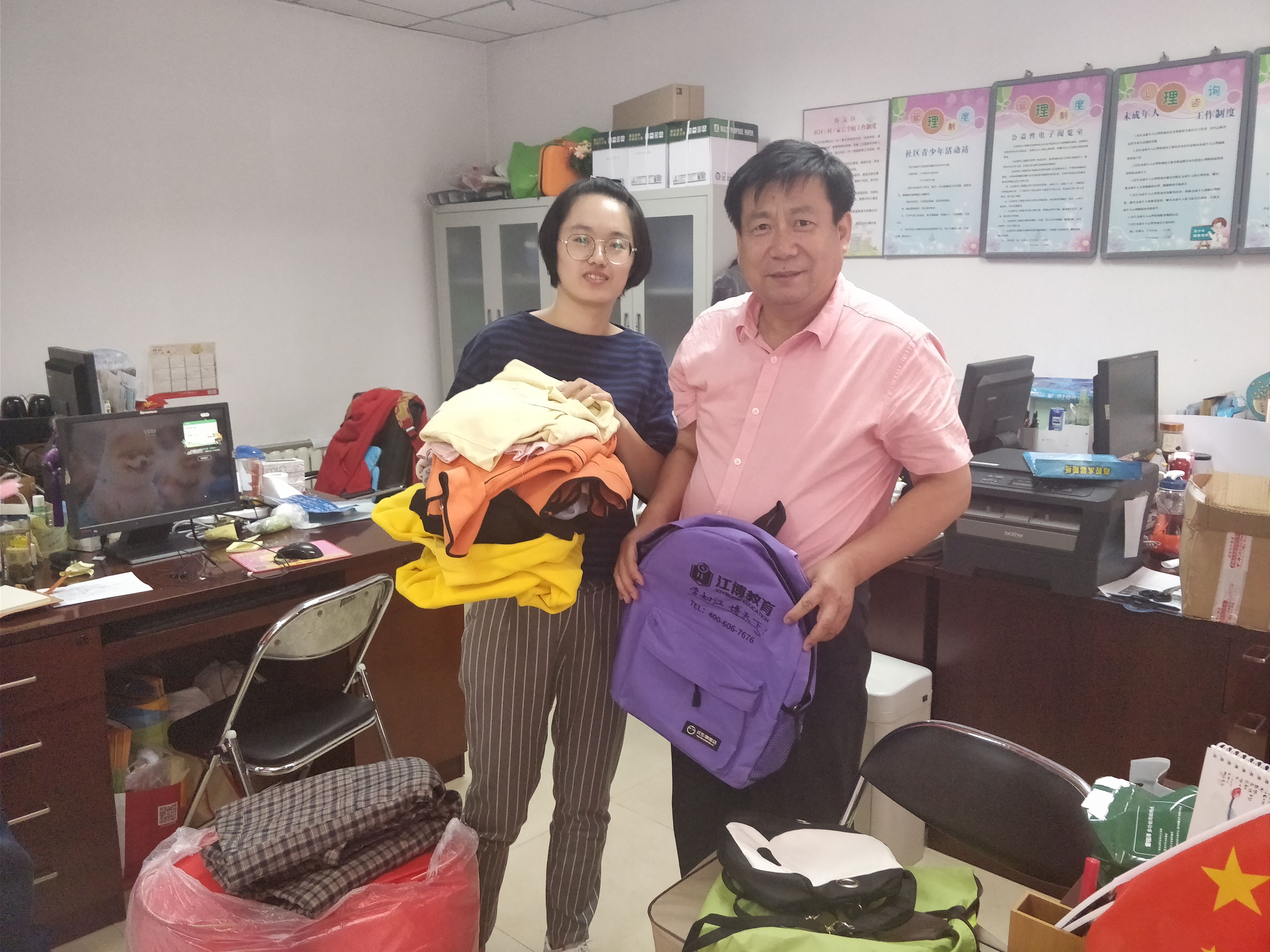 2019年8月,学校党支部在接到上级党组织通知后,号召党员、积极分子和员工行动起来,几天的时间,支部的党员和员工共捐赠线衣11件、棉衣1件、棉被2床、书包9个、工作包1个。8月28日下午,机构将收到的物品送到南里社区妇联会,工作人员热情接收并做了登记,他们统一打包后交由上一级组织,送往新疆和田地区,给和田地区群众送上一份温暖和关怀。