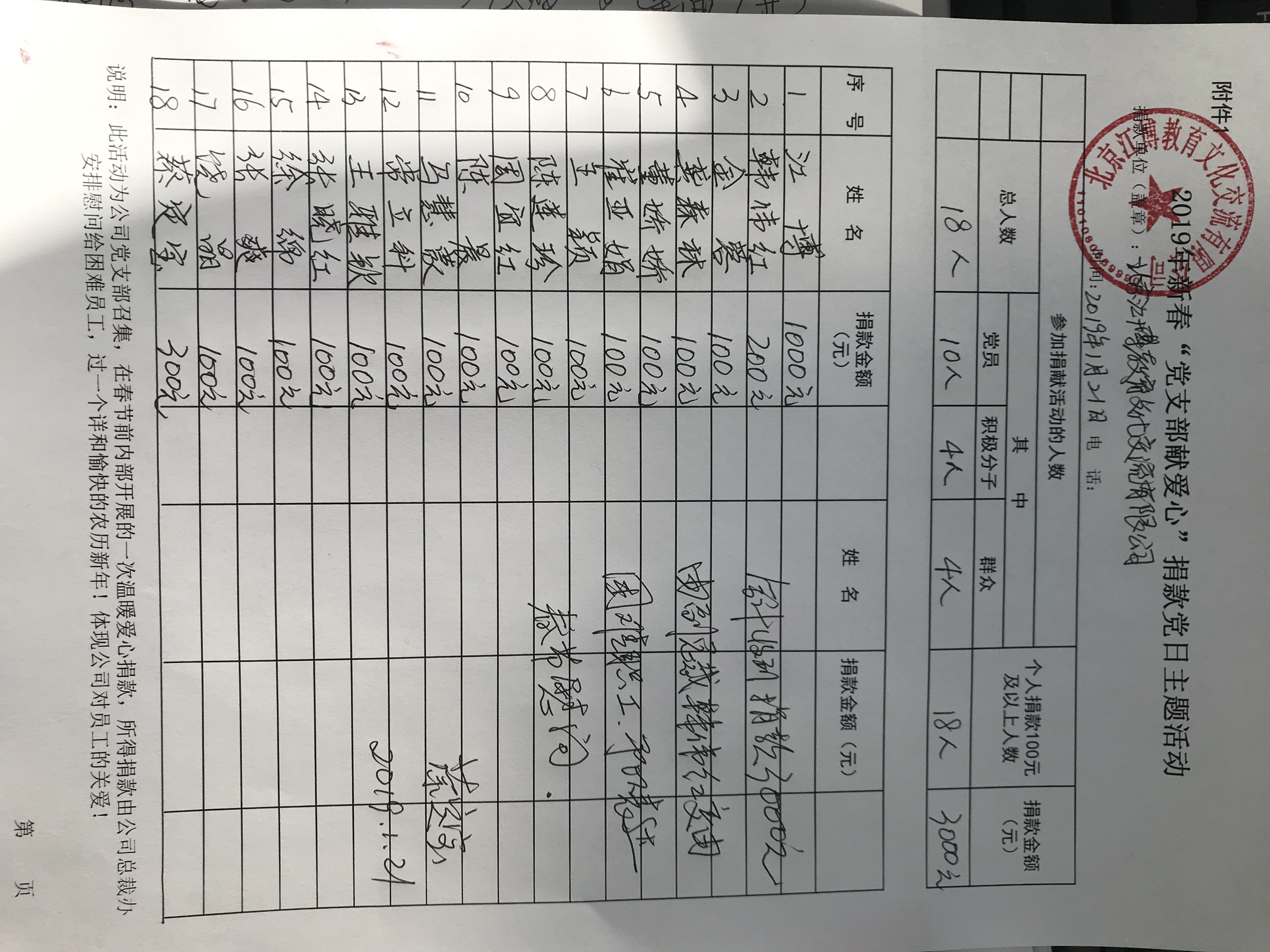 2019年1月,党支部组织员工开展主题为“承传统树新风,献爱心送温暖”的活动,号召大家给困难员工捐款,以慰问困难员工过一个温暖祥和的农历新年。这次活动,共收到捐款3000元,机构交给困难员工予以慰问。
