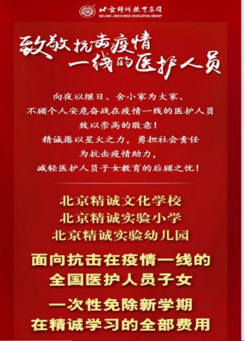 抗疫初期,为减轻医护人员子女教育的后顾之忧,精诚第一时间发布“致敬英雄!精诚一次性免除抗击疫情一线医护人员子女新学期全部费用”公告,用实际行动为抗击疫情助力! 公告发布后,精诚一次性免除抗击疫情一线医护人员子女新学期全部费用110余万元,并受到朝阳区政府、区委统战部等多个政府部门与所属党派通报表扬。