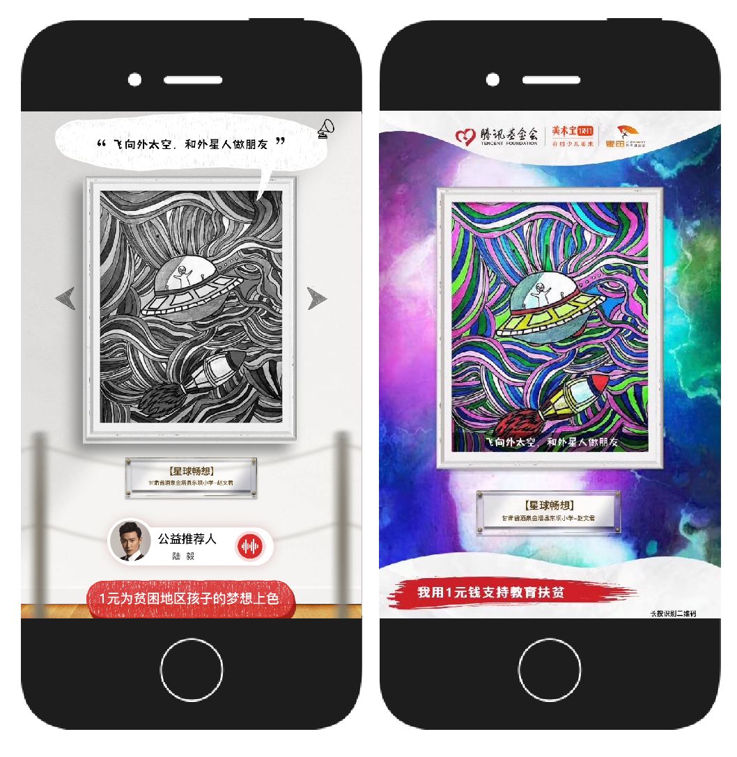 整体项目以#为梦想上色#公益H5展开,以一个孩子站在美术馆门口画画的场景,将用户带入情境。展示出自乡村孩子的代表画作,用动画形式讲述每幅画背后的故事。动画视频结束后,更多孩子的画作逐一展现,但这些画只有黑色和白色。同时,邀请明星公益推荐人陆毅、彭昱畅等进行配音,讲述画作的由来,呼吁人们用1元钱帮助贫困地区的孩子们实现艺术梦想。在线捐出1元后,便可以将所喜欢的画变成彩色。