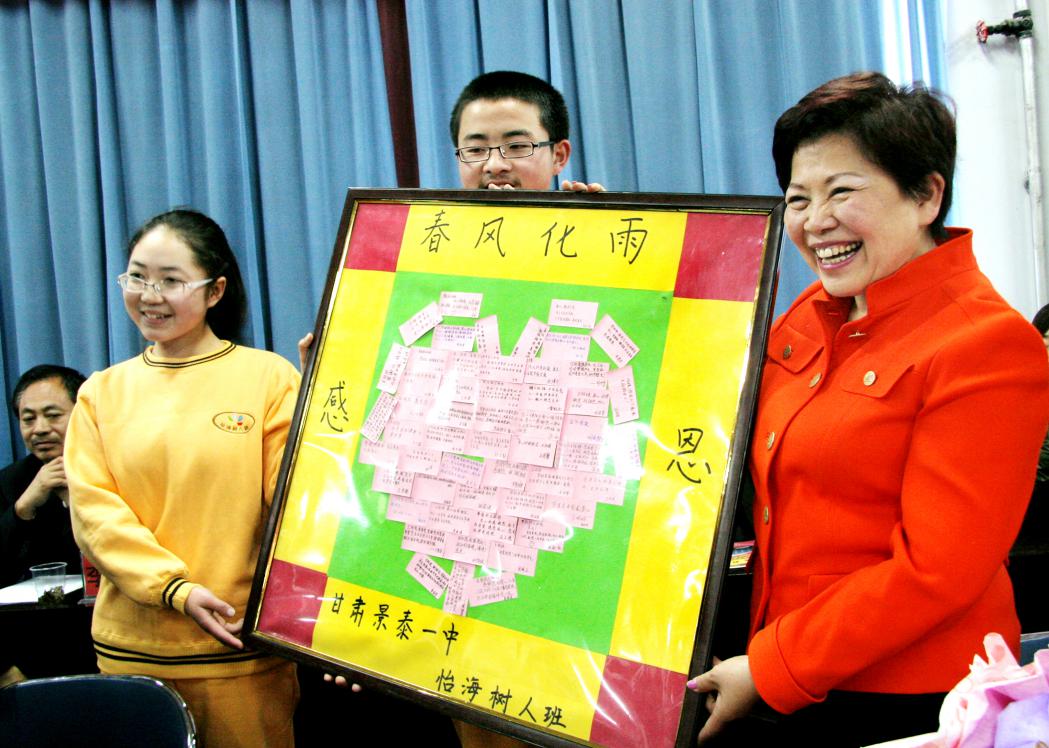 甘肃景泰一中“怡海树人班”学生向王琳达主席赠送礼物