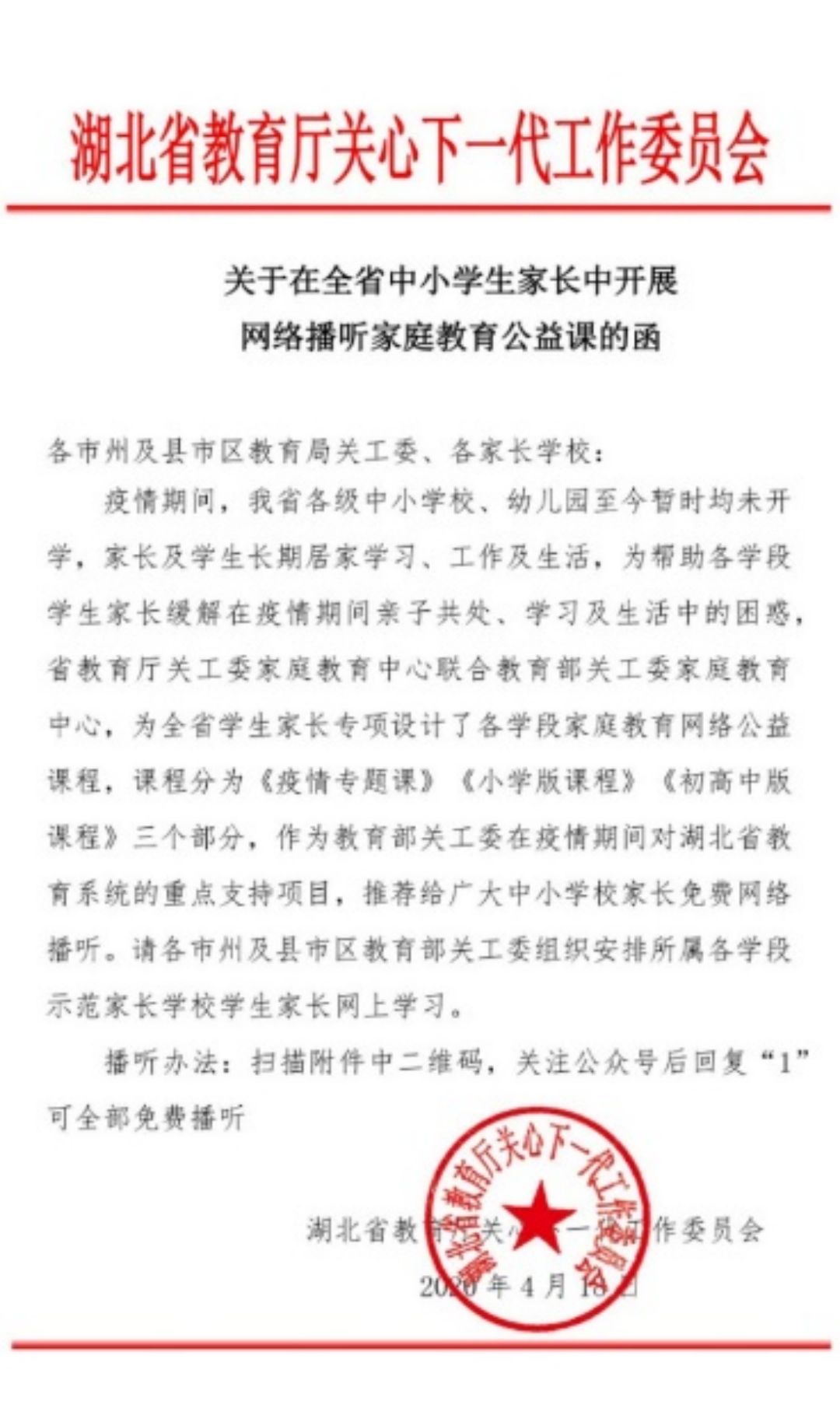 1、湖北省中小学生家长网络播听家庭教育公益课